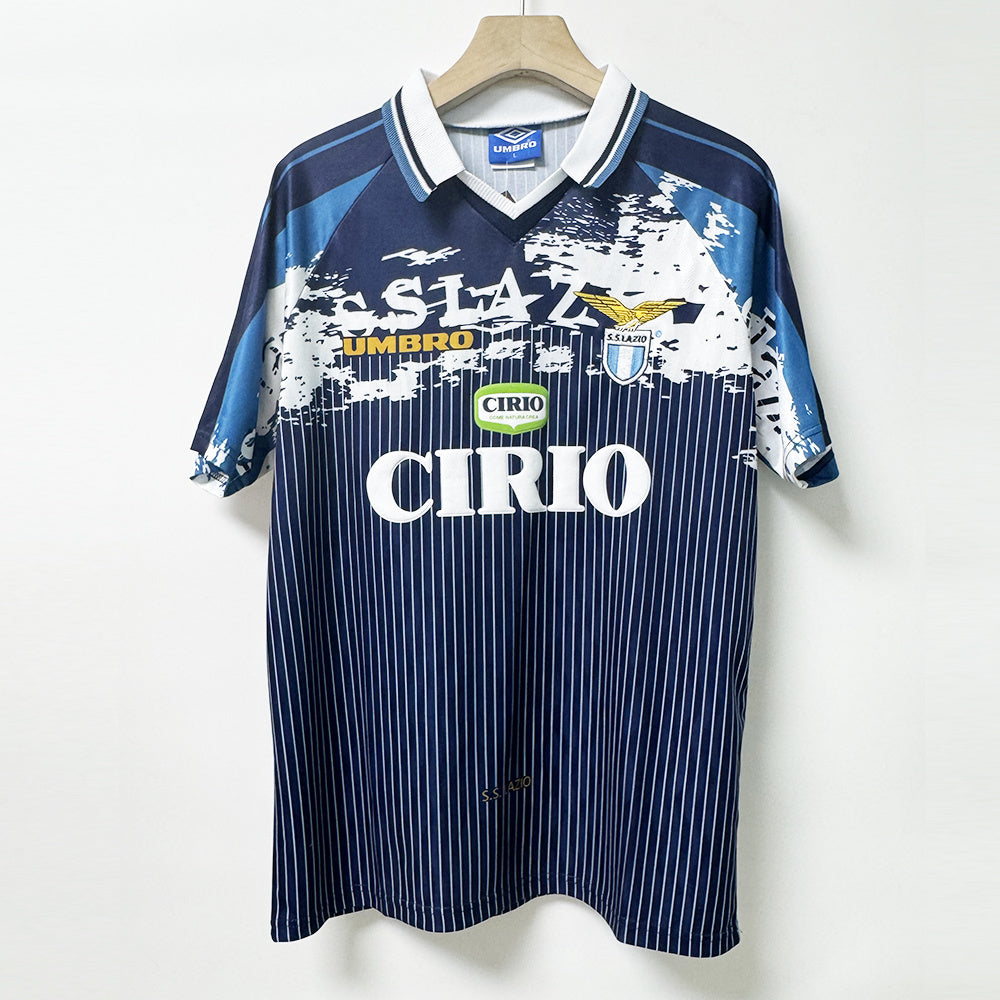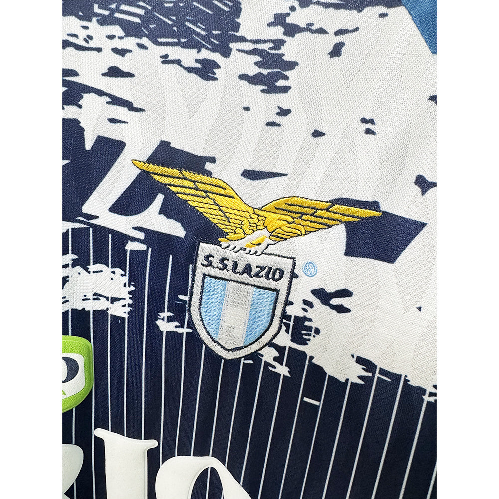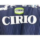 - Il logo Umbro in giallo e la scritta “S.S. LAZIO” in bianco sul petto danno risalto all’orgoglio della squadra, mentre lo sponsor “CIRIO” domina la scena con caratteri decisi, simbolo di un’epoca indimenticabile.