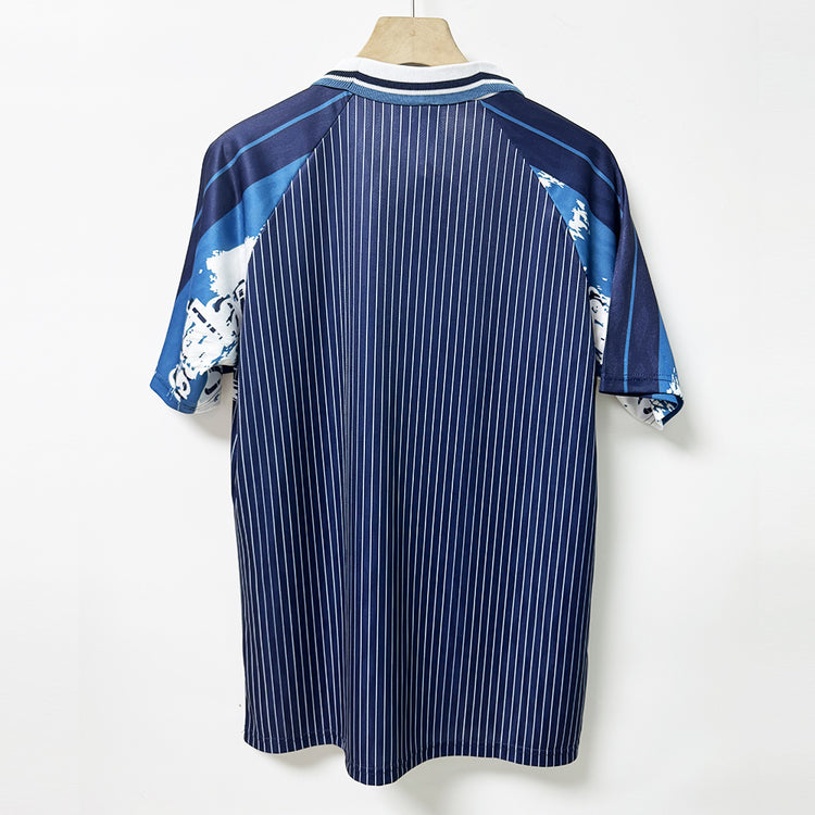 - Le pinstripes verticali nella parte inferiore aggiungono un tocco di eleganza retrò, mentre il colletto bianco con bordo blu richiama le divise classiche degli anni ‘90.