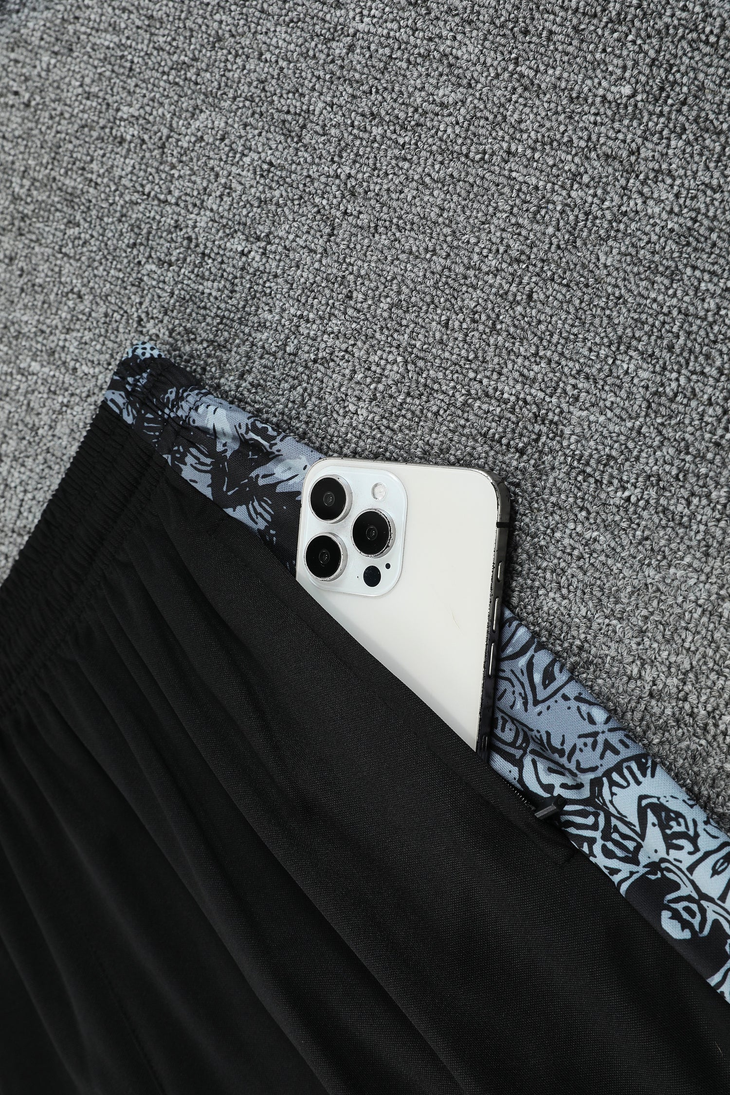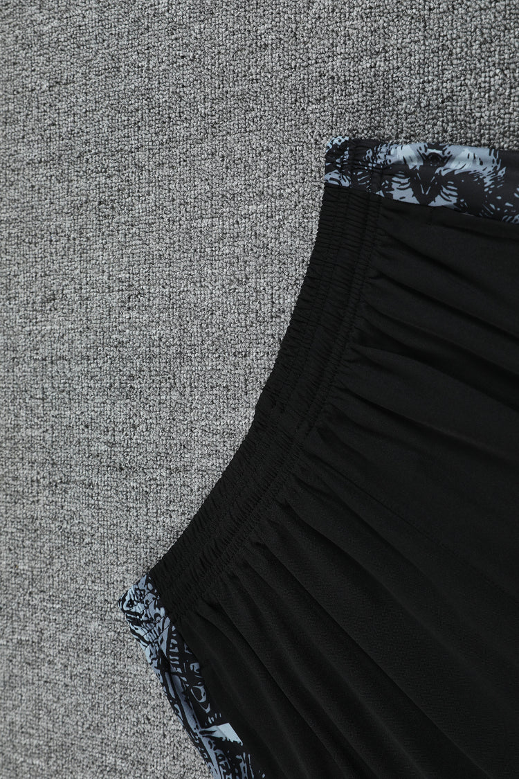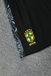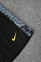 I pantaloncini neri, arricchiti da una fascia centrale con motivi unici, si abbinano perfettamente alla maglia, garantendo un look coordinato che non passa inosservato.