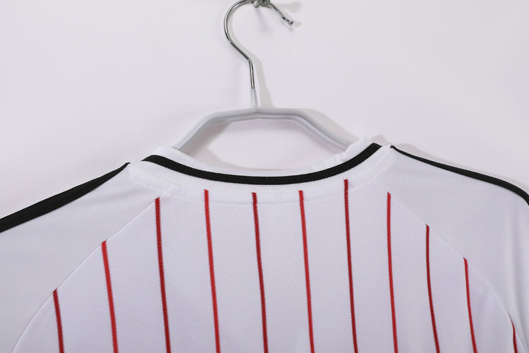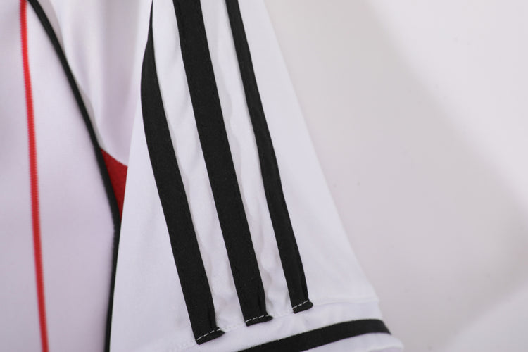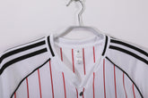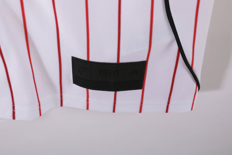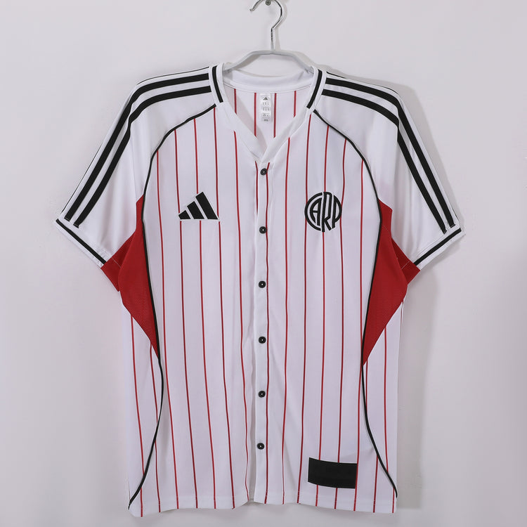 Un omaggio audace alla storia del River Plate, questa maglia modello baseball fonde l’eleganza sportiva americana con l’identità inconfondibile del club argentino. Il bianco dominante è attraversato da sottili righe verticali rosse, mentre le iconiche tre strisce Adidas in nero decorano spalle e maniche. Il design button-up dona un tocco retrò e sofisticato, perfetto per chi vuole distinguersi dentro e fuori dal campo.